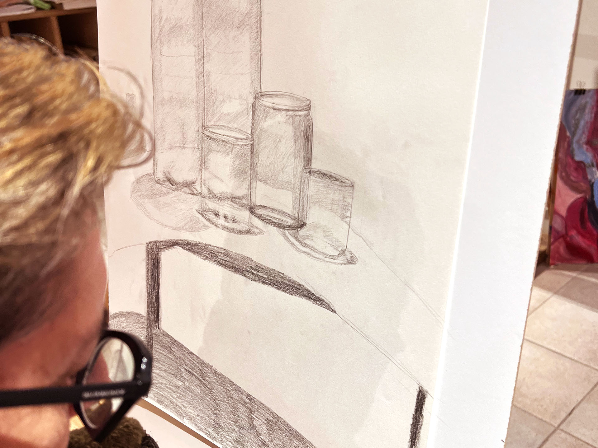 We begin with a selected composition of objects, making use of measuring tools. We try to complete one subject in a week, aiming at placing the objects on paper in the correct proportions and with the tonal gradations produced by light.